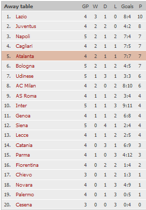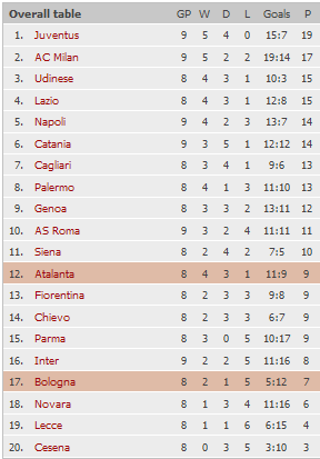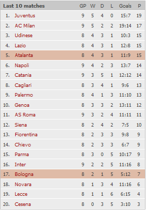 Турнирная таблица, Текущая форма Болоньи и Аталанты , Домашняя таблица Болоньи и гостевая - Аталанты.
