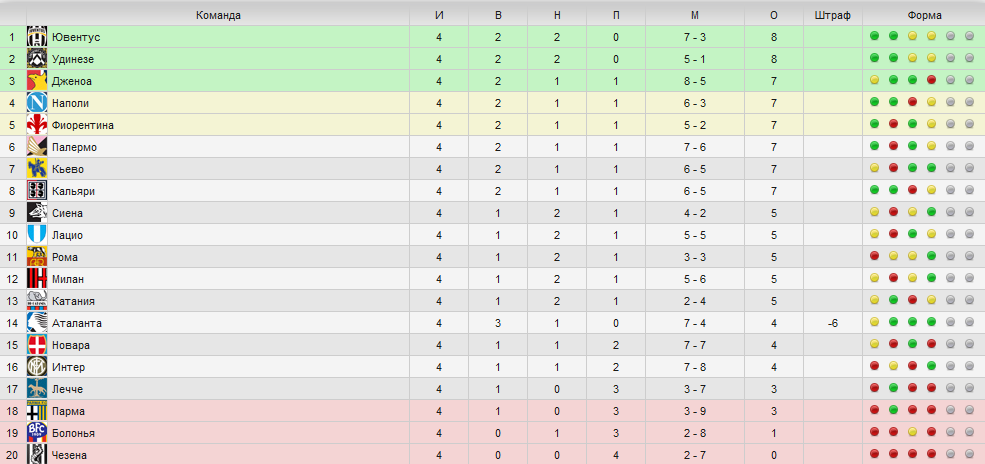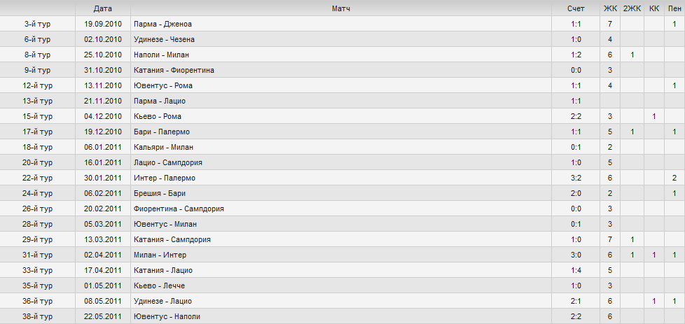В этом году: 2-й тур 11.09.2011 Дженоа - Аталанта 2:2-----6жк ; 1кк ; ------ ; 17 мин. + ; ------------ ; угл 7:3 4-й тур 21.09.2011 Фиорентина - Парма 3:0---4жк ; ----- ; ----- ; 12 мин. + ; 84 мин. + ; угл 5:5 Ювентус дома в этом году: 2-й тур 11.09.2011 Ювентус - Парма 4:1-------2жк ; 1кк ; 1пен ; ----------- ; 89 мин. + ; угл 4:1 4-й тур 21.09.2011 Ювентус - Болонья 1:1----9жк ; 1кк ; ------ ;13 мин. + ; 90 мин. + ; угл 12:5 Милан на выезде в этом году: 3-й тур 18.09.2011 Наполи - Милан 3:1--------7жк ; ---- ; ------ ; 24 мин. + ; ----------- ; угл 2:3