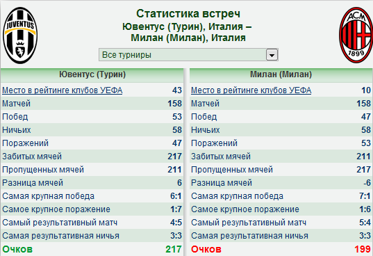 Очные встречи: 21.08.11 Милан - Ювентус 2:1 (2:0) 05.03.11 Ювентус - Милан 0:1 (0:0) 30.10.10 Милан - Ювентус 1:2 (0:1) 22.08.10 Милан - Ювентус 0:0 (0:0) 13.08.10 Милан - Ювентус 1:1 15.05.10 Милан - Ювентус 3:0 (2:0) 10.01.10 Ювентус - Милан 0:3 (0:1) 17.08.09 Милан - Ювентус 1:1 (0:1) 15.08.09 Ювентус - Милан 2:0 10.05.09 Милан - Ювентус 1:1 (0:0)