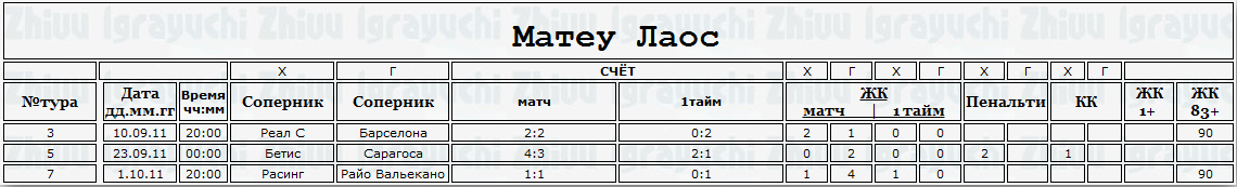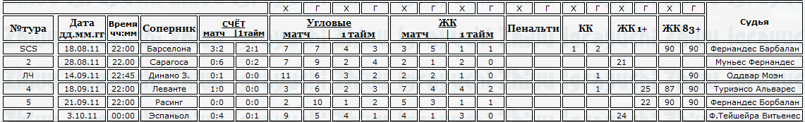 2-й тур Сарагоса --------- Малага 3:5 Уд. 10:8, УГЛ 10:1, ЖК 2:2 (0:1), КК 0:0 Пен 0:0,ЖК 1+,ЖК 84+ 3-й тур Реал С ------------ Реал М 1:2 Уд 1:9, УГЛ 8:3, ЖК 1:2 (0:1), КК 0:0, Пен 0:0,ЖК 84+ 5-й тур Атлетик Б ---- Барселона 1:3 Уд. 4:10, УГЛ 1:8, ЖК 1:1 (0:0), КК 1:1, Пен 0:0 8-й тур Хетафе - Спортинг Хихон 3:0 Уд. 6:3, УГЛ 4:2, ЖК 1:2 (0:0), КК 0:0 Пен 1:0 10-й тур Реал М ------ Атлетико М 2:0 Уд. 13:3, УГЛ 3:7, ЖК 2:2 (0:0), КК 0:0, Пен 0:0 12-й тур Севилья ------ Мальорка 1:2 Уд. 2:8, УГЛ 2:1, ЖК 2:1 (1:1), КК 0:0, Пен 0:0 14-й тур Малага ------------ Расинг 4:1 Уд 6:4, УГЛ 6:4, ЖК 1:0 (0:0), КК 0:0, Пен 0:0 16-й тур Осасуна ------- Сарагоса 0:0 Уд. 5:1, УГЛ 13:2, ЖК 2:2 (0:1), КК 0:0, Пен 0:0 18-й тур Мальорка ----- Альмерия 4:1 Уд. 9:2, УГЛ 8:9, ЖК 2:2 (1:1), КК 0:0, Пен 0:0, ЖК 1++ 23-й тур Эспаньол -------- Реал М 0:1 Уд. 5:10, УГЛ 5:9, ЖК 2:2 (0:1), КК 0:1, Пен 0:0,ЖК 1+ 35-й тур Севилья --------- Реал М 2:6 Уд. 5:10, Угл 10:10, ЖК 2:2(1:1), КК 0:0, Пен. 0:0,ЖК 84+