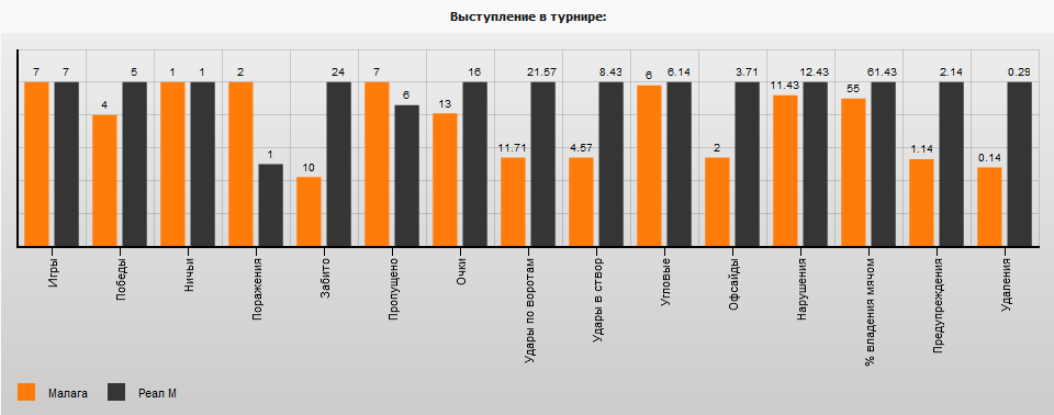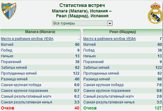Очные встречи: 03.03.11 Реал М - Малага 7:0 (3:0) 16.10.10 Малага - Реал М 1:4 (0:2) 16.05.10 Малага - Реал М 1:1 (1:0) 24.01.10 Реал М - Малага 2:0 (2:0) 04.04.09 Малага - Реал М 0:1 (0:0) 08.11.08 Реал М - Малага 4:3 (2:2) 23.04.06 Реал М - Малага 2:1 (0:1) 11.12.05 Малага - Реал М 0:2 (0:2) 20.03.05 Реал М - Малага 1:0 (0:0) 07.11.04 Малага - Реал М 0:2 (0:1)
