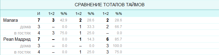 Ну и вот по таймам интересная ставка - посмотрите. У Малаги - дома, у Реала на выезде ни разу 1-й тайм не был результативнее второго, ничья 1-1 соответственно!