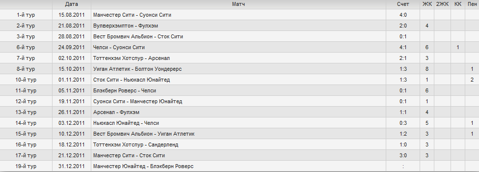 18-й тур 26.12.2011 19:00 Манчестер Юнайтед - Уиган Атлетик 5:0 Блэкберн на выезде: 2-й тур 20.08.2011 18:00 Астон Вилла - Блэкберн Роверс 3:1 4-й тур 11.09.2011 19:00 Фулхэм - Блэкберн Роверс 1:1 6-й тур 24.09.2011 18:00 Ньюкасл Юнайтед - Блэкберн Роверс 3:1 8-й тур 15.10.2011 18:00 Куинз Парк Рейнджерс - Блэкберн Роверс 1:1