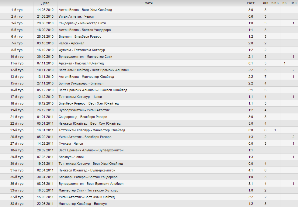 27.11.2010 18:00 Тур 15 Манчестер Юнайтед - Блэкберн Роверс 7:1---жк-0:2 ; ----------- ; ------------ ; угл 5:2