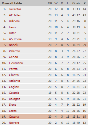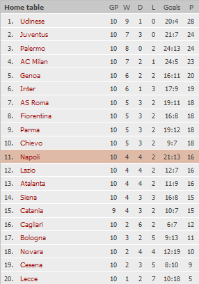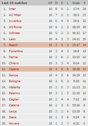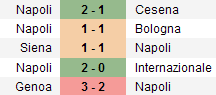 Поехали дальше! "Наполи - Чезена". На этот матч предлагаю 1 ставку: 1)"Ф1(-1.5)" - достаточно популистская ставка,но как мне видится достаточно обоснованная: 1. Наполи неплохо играет дома, учитывая, что в гости к неаполитанцам приехали почти все гранды. В последним 4-х матчах на поле Наполи, хозяева 3 раза пробивали фору в матчах против Чезены. 2. У Наполи сегодня не будет Лавесси, это потеря, но учитывая уровень соперника, то Пандев сможет его заменить. 3. У Чезены не будет Муту, а это серьезно понижает атакующие способности команды, поэтому не удивлюсь 0 от Чезены сегодня. 4. Последний матч Наполи проиграл, поэтому сегодня будут злыми, думаю "морским конькам" сегодня просто будет мало места. 5. Чезена ужасно играет на выезде, почти от всех вменяемый команд, "чезенцы" получали целую авоську мячей.