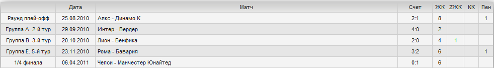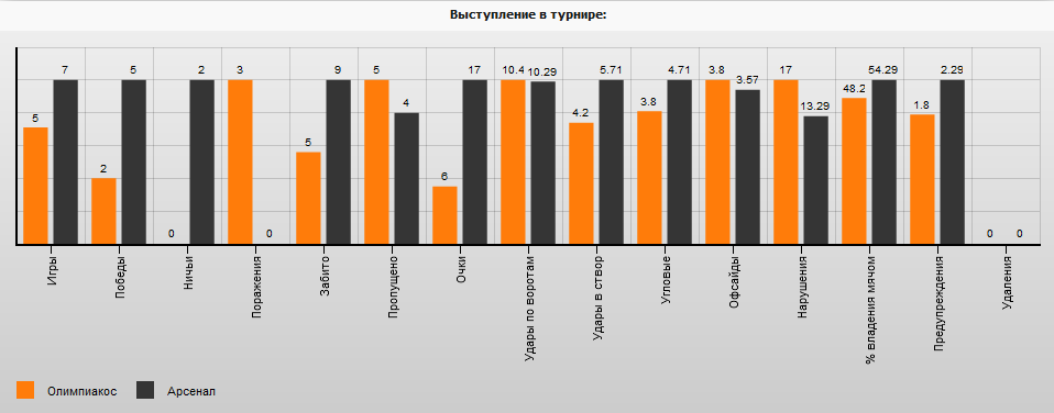 В прошлой Лиги Чемпионов: В этом году в ЛЧ: Раунд плей-офф 16.08.2011 Твенте - Бенфика 2:2-----------1жк ; ----------- ; ----------- ; фолы 11:18 ; угл 5:7 Группа B. 4-й тур 02.11.2011 Трабзонспор - ЦСКА М 0:0----5жк ; 26 мин. + ; ----------- ; фолы 13:14 ; угл 6:4 +2жк/1 ОЛИМПИАКОС В ЭТОЙ ЛЧ: Группа F. 1-й тур 13.09.2011 Олимпиакос - Марсель 0:1----------жк-2:3 ; ------------ ; 86 мин. + ; уд 2:4 ; фолы 23:23 ; офс 4:2 ; угл 2:3 +1кк Группа F. 3-й тур 19.10.2011 Олимпиакос - Боруссия Д 3:1------жк-0:1 ; ----------- ; ----------- ; уд 4:4 ; фолы 11:13 ; офс 4:3 ; угл 3:3 Группа F. 4-й тур 01.11.2011 Боруссия Д - Олимпиакос 1:0------жк-1:3 ; ----------- ; ----------- ; уд 3:2 ; фолы 17:19 ; офс 1:3 ; угл 2:5 Группа F. 5-й тур 23.11.2011 Марсель - Олимпиакос 0:1---------жк-1:1 ; 27 мин. + ; ------------ ; уд 4:6 ; фолы 13:19 ; офс 2:5 ; угл 9:3 АРСЕНАЛ В ЭТОЙ ЛЧ: Раунд плей-офф 16.08.2011 Арсенал - Удинезе 1:0---------------жк-2:4 ; 2 мин. + ; ----------- ; уд 4:4 ; фолы 20:13 ; офс 3:2 ; угл 6:7 Раунд плей-офф 24.08.2011 Удинезе - Арсенал 1:2---------------жк-2:4 ; ---------- ; ---------- ; уд 7:13 ; фолы 14:16 ; офс 5:4 ; угл 3:3 +1пен Группа F. 1-й тур 13.09.2011 Боруссия Д - Арсенал 1:1----------жк-2:1 ; ----------- ; 90 мин. + ; уд 6:3 ; фолы 13:7 ; офс 6:4 ; угл 6:4 Группа F. 3-й тур 19.10.2011 Марсель - Арсенал 0:1--------------жк-3:3 ; 4 мин. + ; 83 мин. + ; уд 2:5 ; фолы 13:13 ; офс 4:4 ; угл 1:9 Группа F. 4-й тур 01.11.2011 Арсенал - Марсель 0:0--------------жк-1:1 ; ----------- ; ------------; уд 7:1 ; фолы 10:12 ; офс 1:2 ; угл 2:4 Группа F. 5-й тур 23.11.2011 Арсенал - Боруссия Д 2:1----------жк-3:1 ; ----------- ; ----------- ; уд 3:4 ; фолы 12:23 ; офс 6:0 ; угл 4:4 ЛИЧНАЯ ВСТРЕЧА: Группа F. 2-й тур 28.09.2011 Арсенал - Олимпиакос 2:1----------жк-2:3 ; ---------- ; 84 мин. + ; уд 5:7 ; фолы 15:15 ; офс 3:3 ; угл 5:6
