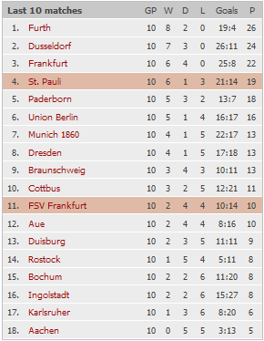 Вторым матчем немецкого "залёта" будет Санкт-Паули - Франкфурт. По этому матчу мне видится одна уверенная ставка - ТБ(2.5) - команды играют крайне результативно, что подтверждает статистика. Дома Санкт-Паули сыграл на ТБ 5 матчей из 6,в гостях Франкфурт - 4 матча из 5. Контора фаворитом дает хозяев, но, по сути, матч может закончиться как угодно, но голов должно быть много. Единственное что смущает - это лички, вчера уже важность личек ощутил в матче Скантропа, но сегодня всё таки думаю, что мне повезет.