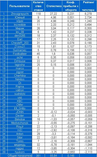 3) В теме кидаем ставки именно одинары(в которых максимально уверены) не более 2-ух в день и ведём рейтинг...рейтинг типстеров считаем по формуле рейтинг типстера = кол-во плюса принесённого в общак * на коэффициент прибыли с оборота...Эта цифра будет определять места типстеров в турнирной таблице
