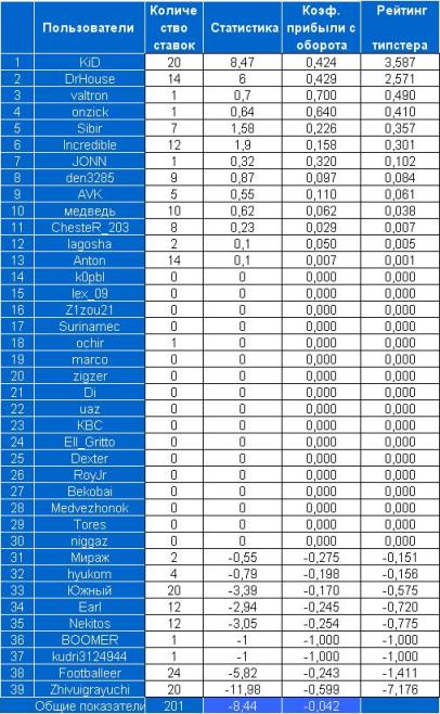 3) В теме кидаем ставки именно одинары(в которых максимально уверены) не более 2-ух в день и ведём рейтинг...рейтинг типстеров считаем по формуле рейтинг типстера = кол-во плюса принесённого в общак * на коэффициент прибыли с оборота...Эта цифра будет определять места типстеров в турнирной таблице