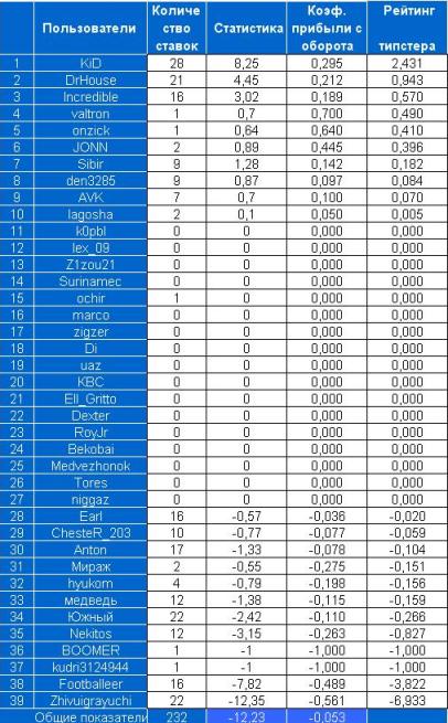 3) В теме кидаем ставки именно одинары(в которых максимально уверены) не более 2-ух в день и ведём рейтинг...рейтинг типстеров считаем по формуле рейтинг типстера = кол-во плюса принесённого в общак * на коэффициент прибыли с оборота...Эта цифра будет определять места типстеров в турнирной таблице