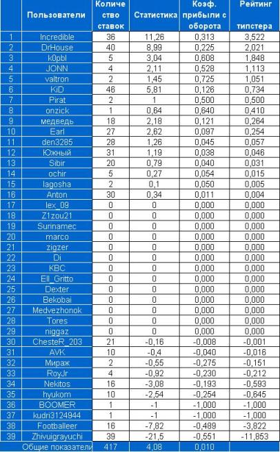 3) В теме кидаем ставки именно одинары(в которых максимально уверены) не более 2-ух в день и ведём рейтинг...рейтинг типстеров считаем по формуле рейтинг типстера = кол-во плюса принесённого в общак * на коэффициент прибыли с оборота...Эта цифра будет определять места типстеров в турнирной таблице