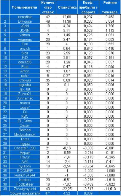 3) В теме кидаем ставки именно одинары(в которых максимально уверены) не более 2-ух в день и ведём рейтинг...рейтинг типстеров считаем по формуле рейтинг типстера = кол-во плюса принесённого в общак * на коэффициент прибыли с оборота...Эта цифра будет определять места типстеров в турнирной таблице