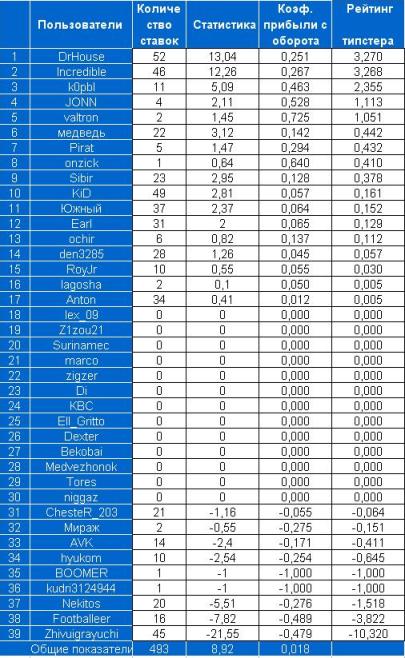 3) В теме кидаем ставки именно одинары(в которых максимально уверены) не более 2-ух в день и ведём рейтинг...рейтинг типстеров считаем по формуле рейтинг типстера = кол-во плюса принесённого в общак * на коэффициент прибыли с оборота...Эта цифра будет определять места типстеров в турнирной таблице