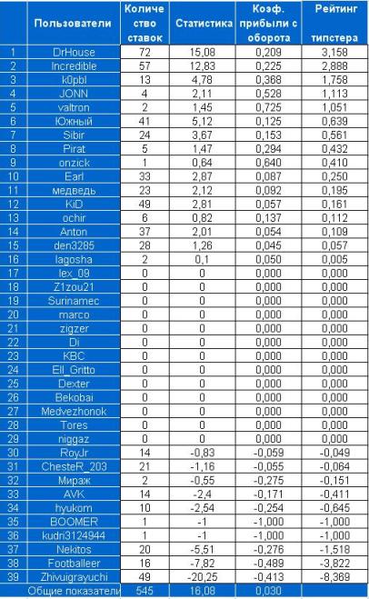 3) В теме кидаем ставки именно одинары(в которых максимально уверены) не более 2-ух в день и ведём рейтинг...рейтинг типстеров считаем по формуле рейтинг типстера = кол-во плюса принесённого в общак * на коэффициент прибыли с оборота...Эта цифра будет определять места типстеров в турнирной таблице